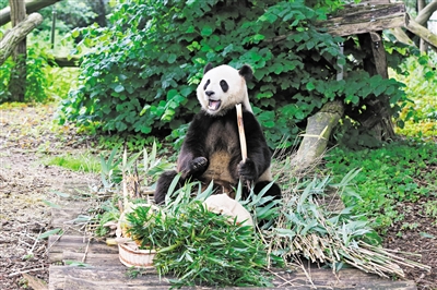 6月2日,在比利时布吕热莱特的天堂动物园,大熊猫“天宝”在享用“生日大餐”。当日,比利时天堂动物园为大熊猫“天宝”举行八岁生日庆祝活动。2016年6月,中国旅比大熊猫“好好”产下雄性幼仔“天宝”,“天宝”成为首只在比利时出生的大熊猫。 新华社记者 赵丁喆 摄