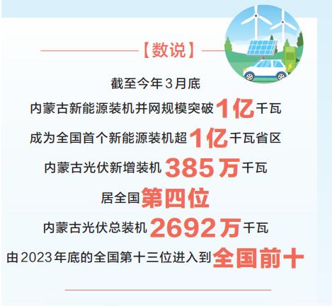 向“光”而行,乘“风”远航,立足“风光无限”的自然资源优势,内蒙古坚持全产业链推进,不断书写新能源产业高质量发展新篇章。截至今年3月底,内蒙古新能源装机并网规模突破1亿千瓦,成为全国首个新能源装机超1亿千瓦省区。