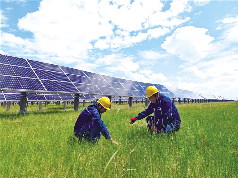 在科右中旗巴彦淖尔苏木贵力斯台嘎查科尔沁沙地歼灭战新能源综合治理区,一块块光伏板专用支架纵横交错,大型机械和头戴安全帽的工人穿梭其中,一眼望不到边的深蓝色光伏组件正汇聚成绿色清洁能源产业发展的“蓝海”,源源不断地把太阳能转化为电能输送到千家万户。下一步,这些光伏板下的盐碱地上,即将生长出一丛丛苜蓿、羊草等优质牧草。