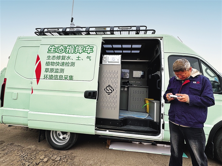空气质量达不达标、土壤环境适不适宜、水质温度够不够……在科右中旗好腰苏木花灯嘎查治沙现场的空地上,一台由蒙草集团自主研发的综合生态指挥车成为治沙“利器”,这些实时数据被一一传回总部,为项目实施、标准基地建植、常规农事生产等综合业务提供准确的数据信息及指导。