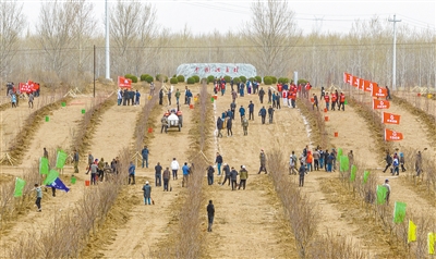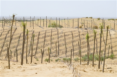 “三元套嵌”治理模式对流动沙丘、固定和半固定沙丘、滩涂低地采取精准治理;冷藏苗避风造林技术利用低温保鲜技术延缓苗木发芽期,等到气温升高、风沙少的时候再出库进行栽植,有效提高造林成活率和保存率……因地制宜、分类施策,以水定绿、适地适树,科学的治沙理念和治沙方式确保治一片、成一片、绿一片。