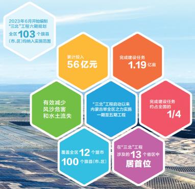 2023年6月,习近平总书记到内蒙古考察,主持召开加强荒漠化综合防治和推进“三北”等重点生态工程建设座谈会,发出坚决打好“三北”工程攻坚战、努力创造新时代中国防沙治沙新奇迹的动员令,并亲自部署了“三北”工程三大标志性战役——黄河“几字弯”攻坚战、科尔沁和浑善达克两大沙地歼灭战、河西走廊—塔克拉玛干沙漠边缘阻击战。
