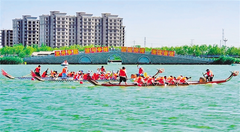 6月10日,巴彦淖尔市端午节龙舟赛在磴口县北海湿地公园火热举行,共有2个组别、12支队伍参赛。一声锣响后,龙舟队员以整齐划一的节奏击水飞舟,迎着浪花奋力前行,现场吸引了2.3万名观众观战。图为紧张激烈的龙舟赛场。
