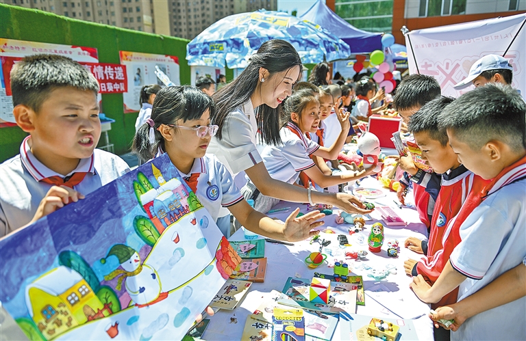 近日,呼和浩特市赛罕区金桥小学组织师生在该校夏日集市上开展爱心义卖。共有43个班级2300余名学生参加,筹集爱心善款3万余元,这笔善款全部用于对困难学生资助或社会公益事业。通过义卖活动不仅传递了爱心与温暖,同时还培养了学生的公益意识和社会责任感。本报记者 王磊 摄