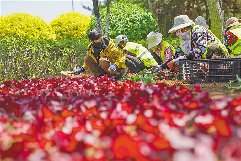 日前,呼和浩特市园林工人在街边绿化带内栽植红花矾根等观赏性花卉。连日来,呼和浩特市园林绿化等部门在市区主要道路、重要景观节点、各公园栽摆56万株时令花卉,打造亮丽宜人的城市环境。
