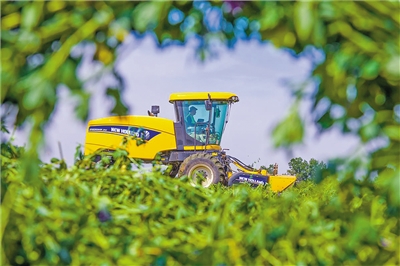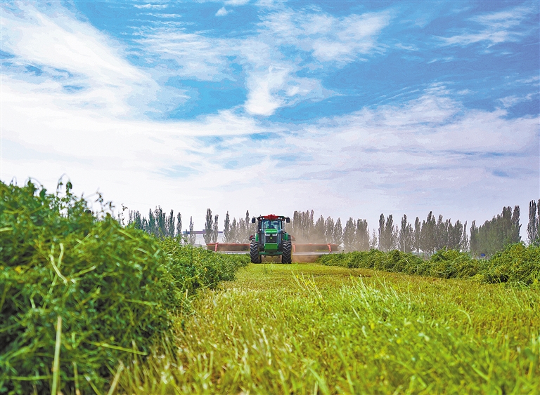 紫花苜蓿草被称为“牧草之王”,蛋白质含量能够达到20%以上,是一种非常适合奶牛吃的牧草品种。与其他经济作物不同,紫花苜蓿草一年可以收4茬,眼下正在进行的是第一茬的收割。