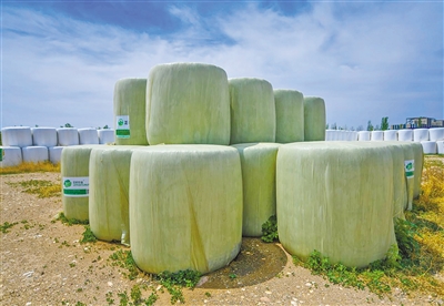 “收割完的苜蓿草会用多层的拉伸膜打包成高1.2米、宽1米的圆柱形‘草罐头’。由于形成了密封厌氧的环境,封闭性比较好,发酵后的牧草不易腐烂变质,可将保质期延长至2到3年,也避免了苜蓿营养物质的损失。”在收割现场,苜蓿草种植基地负责人告诉记者,“草罐头”发酵后会产生乳酸菌,且在饲喂过程中不存在二次氧化、腐烂、霉变等问题,提高了青贮饲料的品质与利用率,同时还会产生一种非常浓郁的芳香味道,不仅营养价值更高,而且能帮助奶牛提高产奶量。