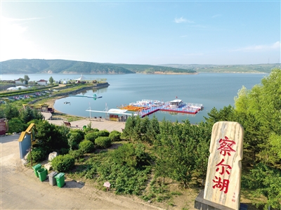 6月的察尔湖旅游景区,湖面波光粼粼,环湖的群山满目绿色。通往景区的道路就是一条园林景观路,油松、花灌错落有致,令人赏心悦目。