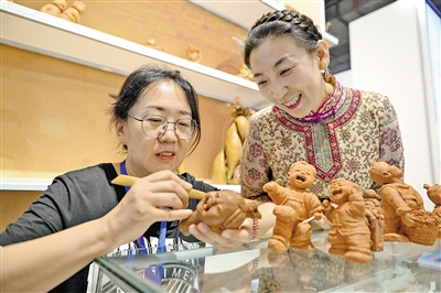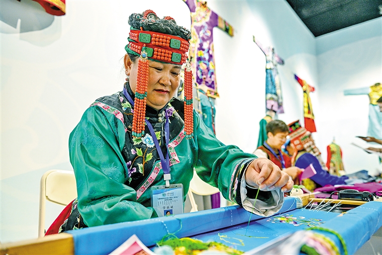 在和林格尔剪纸展台前,一把剪刀、一张红纸,在段建珺手里上下翻飞间,一幅虎虎生威、形态传神的老虎剪纸作品跃然而生。中国剪纸(和林格尔剪纸)国家级代表性传承人段建珺说:“剪纸可以把中华优秀传统文化的精髓保留下来、传承下去,并服务于人民,希望更多的人关注、传承剪纸艺术。”从事泥塑非遗技艺25年的乌拉特泥塑传承人阿拉腾其木格告诉记者,她特意从巴彦淖尔赶到呼和浩特参加这场非遗盛宴,就是为了让更多的人了解乌拉特泥塑。和阿拉腾其木格一样,蒙古族刺绣技艺传承人吴海英也带着非遗技艺从赤峰赶到活动现场,展示蒙古族刺绣的魅力。