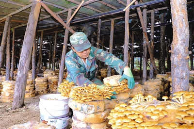 在内蒙古森工集团阿里河森工公司齐奇岭林场职工汤义家的滑子菇栽植大棚,一团团、一簇簇鲜嫩的滑子菇长势喜人,汤义正和工友忙碌地采摘成熟的滑子菇进行晾晒。他说,经过多年的发展,齐奇岭林场已成为远近闻名的食用菌之乡,林场职工群众年培植量达600万袋以上,特别是今年已突破800万袋,培植户平均年增收7万元至8万元。
