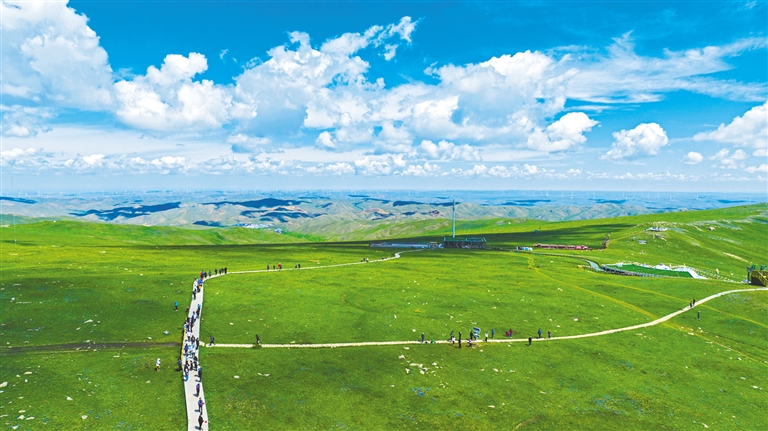 7月7日,游客在包头市固阳县春坤山景区内观光游玩。春坤山是内蒙古西部最大的高山草甸草原,总面积达33平方公里,主峰红芪峰海拔2340米,是包头市至高点,被誉为“鹿城之巅、云中草原”。近年来,固阳县依托秦长城国家文化公园构建起多层次、多样化、多业态的旅游发展体系,随着春坤山、马鞍山等景区设施的逐步完善,来固阳县观光旅游的游客越来越多。本报记者 孟和朝鲁 摄