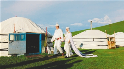 | 在呼伦贝尔市陈巴尔虎旗莫尔格勒河畔的蒙古包前,正在进行一场简朴的新式婚礼。本报记者 李新军 摄 |