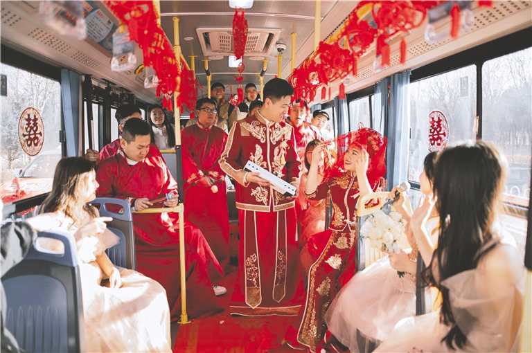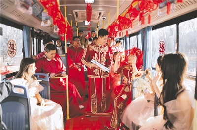 | 在巴彦淖尔市临河区,一辆新能源公交车摇身一变成了婚车,载着一对新人和亲朋好友奔赴“下一站幸福”。