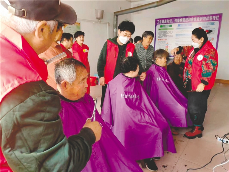| 包头市土右旗苏波盖乡爱心志愿团队为村居老人理发。