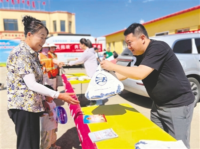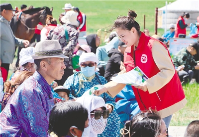 | 在锡林郭勒盟阿巴嘎旗草原那达慕上,志愿者为牧民群众发放移风易俗宣传单。本报记者 巴依斯古楞 摄 |