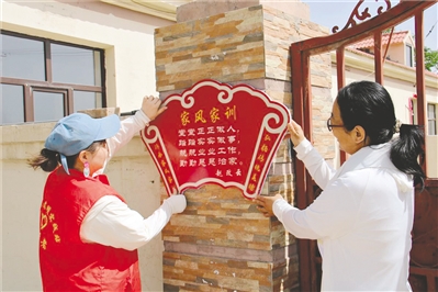 | 乌海市海南区拉僧庙镇组织引导村民将制作好的家风家训牌悬挂在自家门前,让家训涵养家风,让家风带动民风。本报记者 郝飚 摄 |