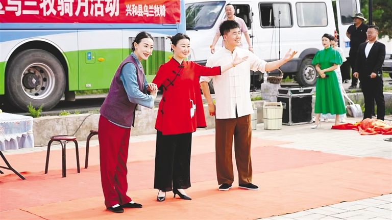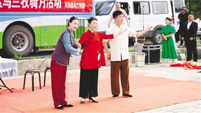 | 乌兰察布市兴和县乌兰牧骑在店子镇古城村开展文艺宣传活动,图为移风易俗小戏《亲家上门》演出现场。张楚东 摄 |
