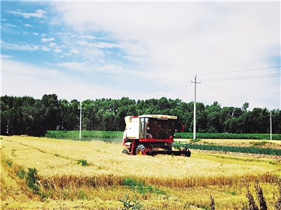 7月9日,一台大型联合收割机在收割小麦。在巴彦淖尔市乌拉特前旗乌拉山镇沙脑包村,大型联合收割机开足马力在金黄的麦田里穿梭作业,收割、脱粒、除杂,一气呵成,颗粒饱满的麦子装满机仓,田间地头呈现出一派丰收的景象。这也标志着河套灌区55万亩小麦迎来收获季。