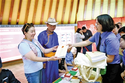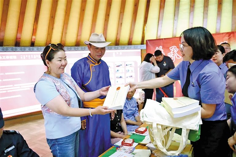 近日,包头市达尔罕茂明安联合旗人民检察院检察人员来到旗明安镇,开展了“法润万家 护航北疆”普法宣传活动,向牧民赠送了民法典书籍,为牧民和护边员讲解了劳动者权益保护、妇女儿童权益保障等法律法规,让牧民乐享“法治大餐”。