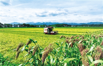 7月13日,在湖南省常宁市胜桥镇尹桥村,农民驾驶农机在收割早稻(无人机照片)。时下,多地早稻陆续成熟,当地农民抢收早稻、翻耕稻田、抢插晚稻。 新华社发
