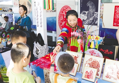 7月18日,来自青海的民间艺术家在活动上展示手工艺品。当日,中华民族共同体体验馆2024年第三期中华优秀文化体验项目开展仪式在北京举行。来自青海省和浙江省的艺术家们在体验活动上展示歌舞戏剧节目,同时还举办相关文化展示活动。