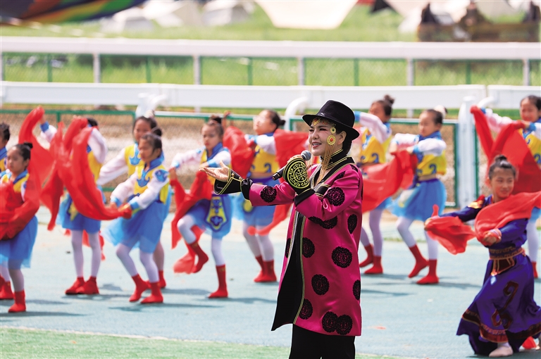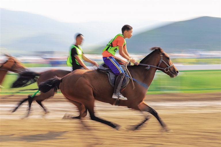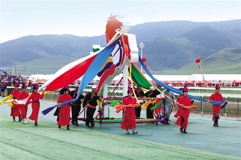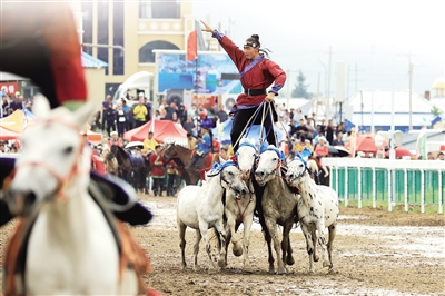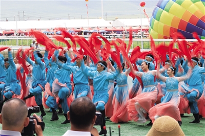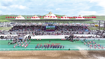 蓝天白云与之相伴,牛羊骏马与之共驰。跑道旁,是水草丰美的乌兰毛都草原;跑道上,是精彩纷呈的马术表演,欢乐与祥和洋溢在共赴草原盛会的每一张幸福笑脸上。开幕式上,身着节日盛装的牧民们用草原儿女特有的方式庆祝盛会,充满草原风情的文艺表演赢得了现场观众的欢呼喝彩。