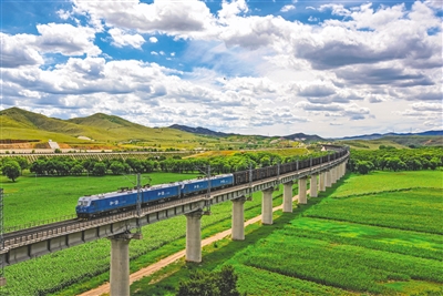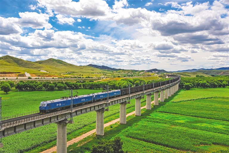 7月28日,一列万吨煤炭列车行驶在唐包铁路霸王河二号特大桥上。针对全国多地持续高温天气的实际,中铁呼和浩特局呼和浩特机务段积极落实电煤保供工作部署,加强运力保障和精准保供,促进电煤运输持续上量,全力保障迎峰度夏电煤供应。本报记者 马骏驰 摄