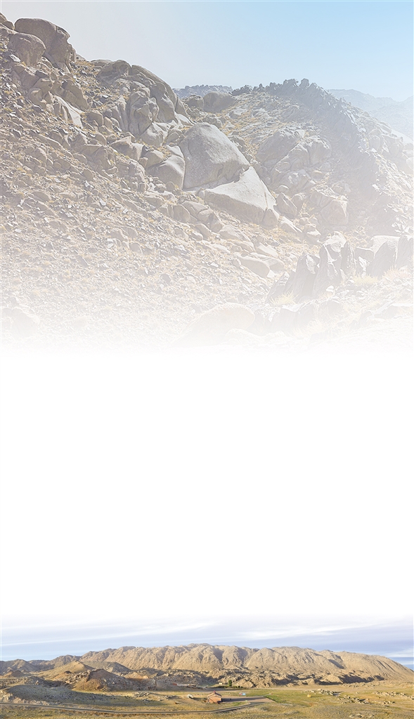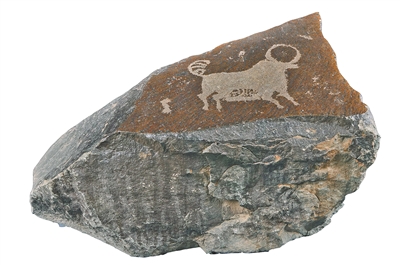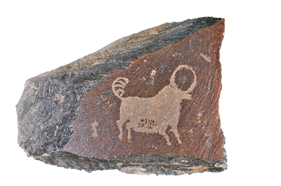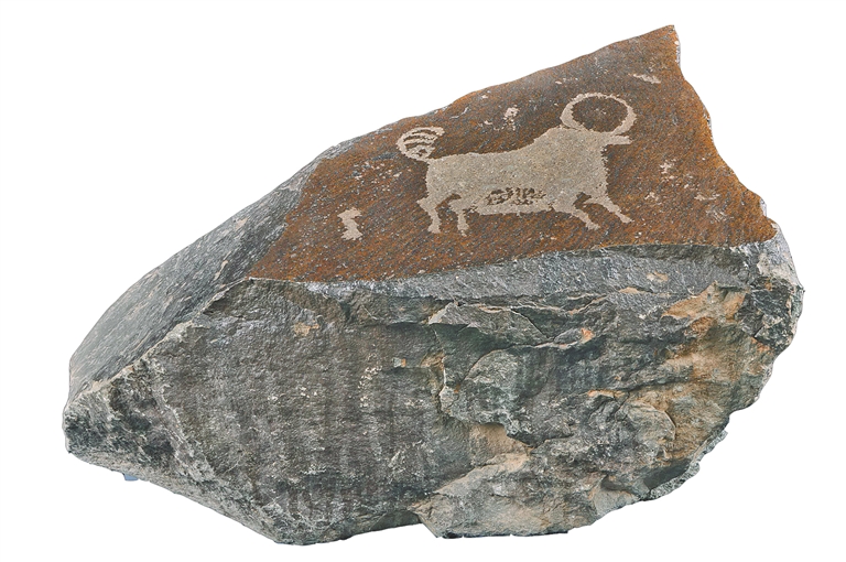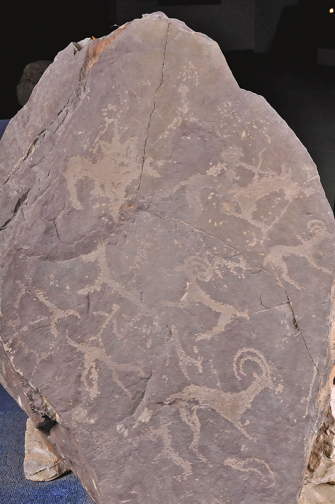步入包头博物馆《史话石说——内蒙古古代岩画陈列》展厅,赫然入目的是一块浑然天成、沧桑厚重的峥嵘磐石,“史话石说”四个古朴粗拙的大字扑面而来。展厅阿拉善岩画部分,巨型写真喷绘让观众置身于广袤无垠的山脉荒漠中,蓝天白云下的曼德拉山气势巍峨。一级文物——刻着牦牛图案的黑褐色岩石十分引人注目。