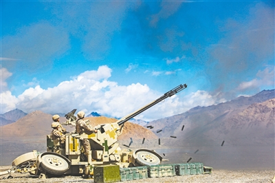 新疆军区某火力团组织防空分队进行实弹射击演练(7月31日摄)。八一军旗,高高飘扬;八一军徽,熠熠生辉。97年来,英雄的人民军队捍卫万里山河,守护万家灯火,筑起坚不可摧的钢铁长城。“八一”建军节之际,全军官兵在各自战位上,以军人特有的方式庆祝中国人民解放军建军97周年。 新华社发