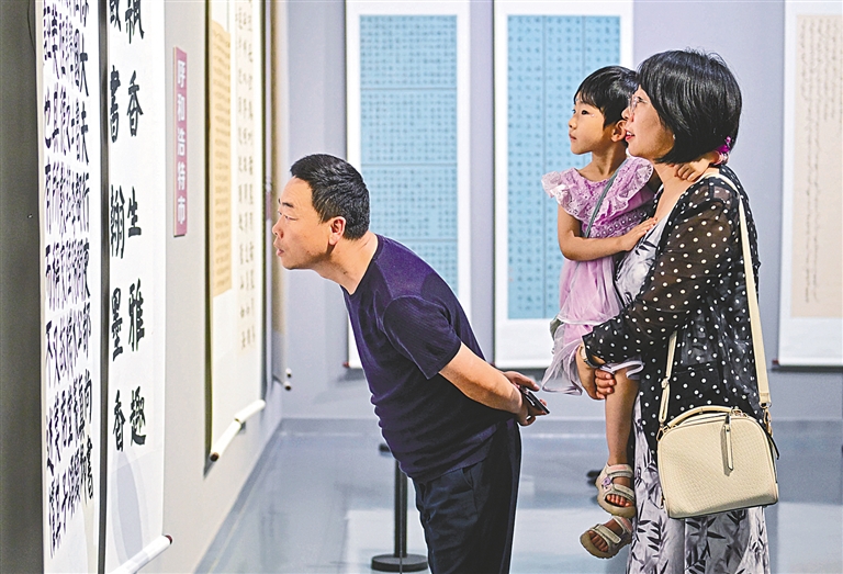 8月2日,观众在内蒙古美术馆欣赏书法篆刻作品。当日,第五届内蒙古自治区青年书法篆刻作品展在内蒙古美术馆举行,展出了全区175位青年作者创作的400余幅作品。该展览旨在弘扬中华优秀传统文化,为广大青年作者提供更为广阔的创作、展示、交流的平台。本报记者 王磊 实习生 姚子超 摄