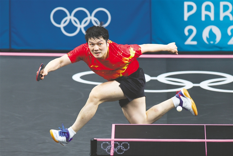 8月4日,樊振东在比赛中。当日,在巴黎奥运会乒乓球男单决赛中,中国选手樊振东4比1战胜瑞典选手莫雷高德,夺得金牌。