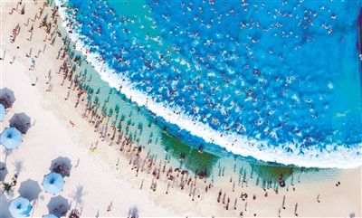 8月3日,游客在四川省泸州市纳溪区欢乐派海滩公园戏水游玩(无人机照片)。盛夏时节,人们戏水休闲,享受清凉。