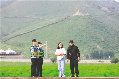 盛夏,乌兰毛都草原迎来最美时节,各地游客慕名而来。驻守在这里的兴安边境管理支队乌兰毛都边境派出所立足旅游旺季特点,推出“前置型、服务型、智慧型”的护旅驿站,将警力前置到景区关键区域,确保游客在享受美景的同时,也能感受到安全和便捷。图为民警为游客提供咨询服务。包青松 摄