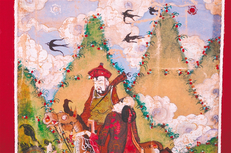 “唐卡修复是一项繁琐而又复杂的工作。撕裂、破洞、边框装裱部分开裂,是唐卡常见的损坏现象。另外,由于年代久远,唐卡的画面也容易有污渍。《主仆出行图》唐卡的画面借鉴民间一种去污办法成功地进行了清理,把莜麦面用开水和成面团,在画面上反复滚搓。这种方法在使用时把握滚搓力度是关键。”栗征华说。在专家们的倾心修复下,《主仆出行图》唐卡熠熠生辉地呈现在人们面前,用一幅简单的画面生动描绘了当时人们的生活场景,为后人留下宝贵的文化财富。