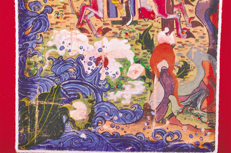 包头博物馆征集保管部工作人员申琳介绍:“这幅唐卡对人物和马匹使用了漫画式的夸张技法,突破了传统唐卡对绘画量度精确要求的束缚。传统唐卡对画面人物身体的比例、五官的形状都有精确的规定,在构图敷色环节有着严格的规范,画面中的人物、景物等都有特定的比例和位置。色彩的运用也遵循着传统的规则,每种颜色都具有象征意义,如红色代表威严、黄色代表吉祥、蓝色代表神圣等。《主仆出行图》唐卡画法简练,线条勾勒随意活泼,色彩鲜明欢快。除在祥云、浪花等处略有渲染外,其他颜色基本一次完成。这种画法虽然不同于传统唐卡的严谨、注重色彩渲染以及精细的线条勾勒,但是在祥云、浪花等图案的绘制上,又与传统唐卡技法一致。”