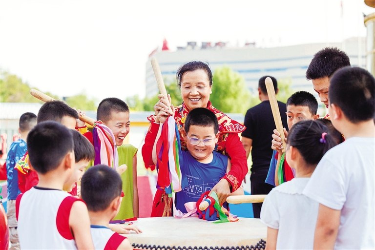 8月8日,寿阳鼓非遗传承人正在和孩子们互动。当日,呼和浩特市托克托县新营子镇黑水泉村新时代文明实践志愿服务队举办了“非遗铸童心”暑期培训活动。近年来,托克托县把新时代文明实践作为农村精神文明建设的着力点,不断寻找新路径,探索新方法,满足群众精神文化需求。本报记者 郑学良 实习生 乌力更 摄