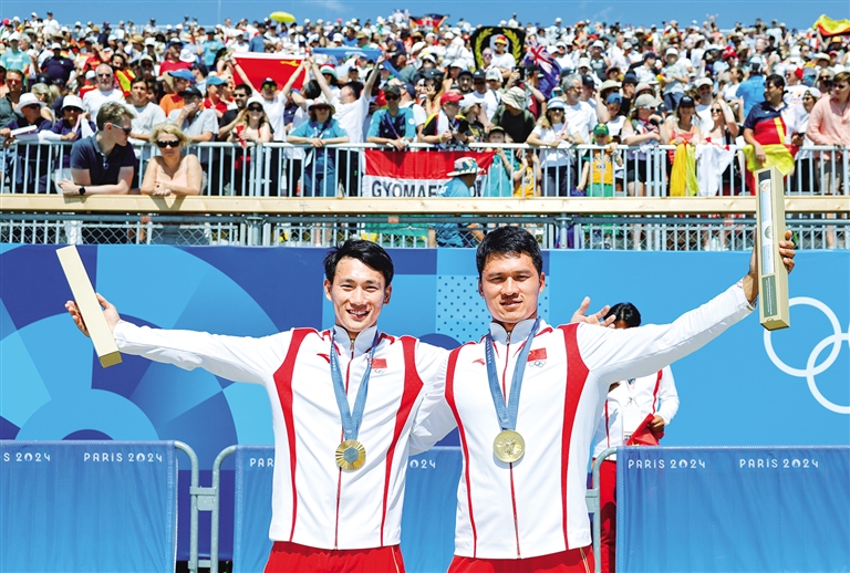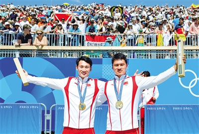 8月8日,中国选手刘浩(右)、季博文在颁奖仪式后。当日,在巴黎奥运会皮划艇静水男子双人划艇500米决赛中,中国选手刘浩、季博文夺得金牌。 新华社记者 沈伯韩 摄