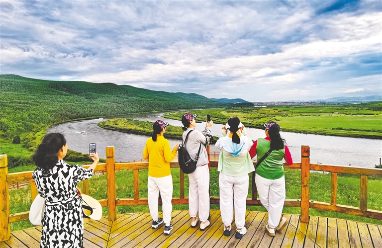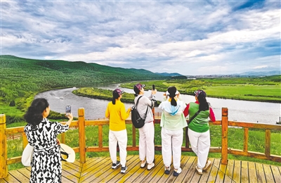 来自武汉的游客正在额尔古纳市欣赏中俄两国边境风光。今年我区各地旅游市场火热,额尔古纳市更是如此。许多游客在额尔古纳市体验独特的民族风情的同时,也留下了美好的回忆。