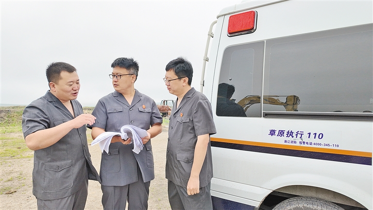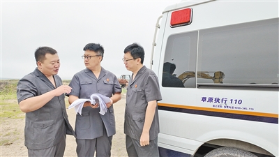 通辽市中级人民法院创新建立“草原执行110”机制,开通24小时接警热线,成立快速反应队伍,建立跨区域协作执行模式,集约高效处理被执行人拘传、财产查封等执行工作。图为近日该院执行法官根据申请人拨打“草原执行110”提供的线索研究案情,查找被执行人。宝纯 摄