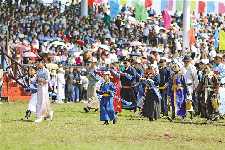 7月14日,在美丽的锡林河畔,“相约草原·遇见那达慕”内蒙古自治区第34届草原那达慕在锡林浩特市开幕,吸引了约10万名游客和当地群众,共赴辽阔草原,感受特色民族文化。