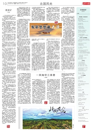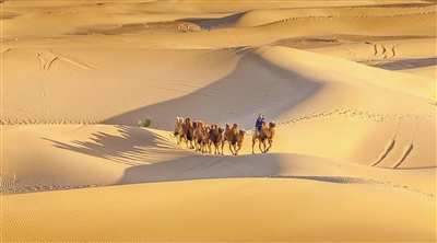 最后一幅画卷,便是勤劳耐受的驼队。老话说:“家财万贯,带毛的不算。”骆驼驮着牧人殷实丰厚的财产,一峰峰骆驼像一座座移动的小山。掌管驼队的男主人沉着冷静,守护周全的男青年威武强健。骆驼迈开厚实的驼掌,像永不停歇的永动机,驮载的是希望,给人以力量。在牧民心中,骆驼是值得信任的朋友。它们吃苦耐劳,吃带刺的杂草果腹却极少生病,像沙漠中顽强求生的荆灌,挺过酷热干燥,迎接风沙肆虐,忍耐雨水稀缺,心中有光而努力存活。这顽强的生存能力着实令人惊叹,这不屈的战斗精神同样也让人肃然。