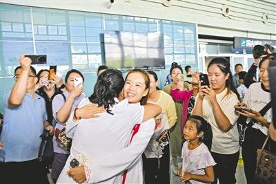 8月17日,奥运会女子20公里竞走冠军杨家玉满怀喜悦从北京回到了家乡乌海,与家乡人民热情拥抱。当天下午3点,家乡人民用热烈的仪式欢迎奥运冠军荣耀返乡。“一年多没回家了,非常想念我的家乡、我的亲人,这段时间我会好好陪陪家里人,去冲冲沙,去乌海湖逛逛。”杨家玉说。本报记者 郝飚 摄