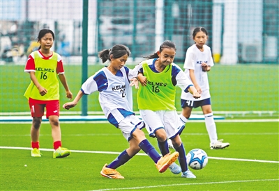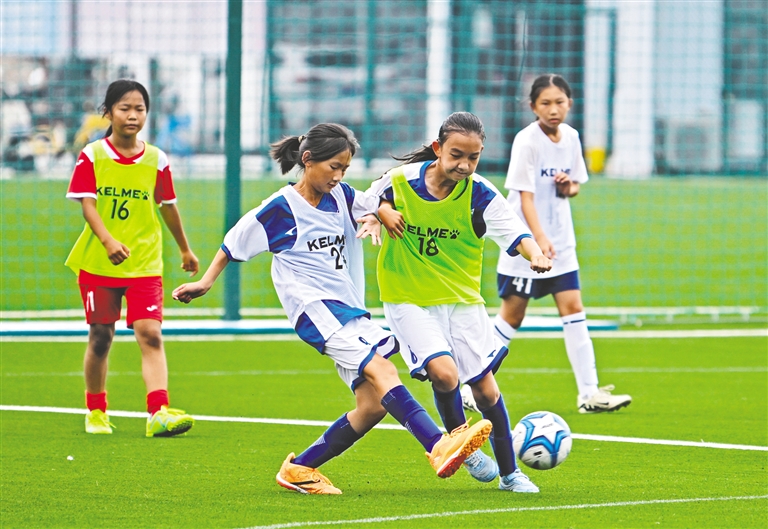 8月17日,河南洛阳女足青训中心U11球员侯佳怡(左二)与梁媛乔(右二)在混合组分组对抗中拼抢。当日,由中国足协主办,天津市足协承办的2024年中国足球协会“玫瑰绽放”夏令营北方大区U11组天津赛区比赛收官,来自北京、天津、辽宁等省市的10支U11女足青训队的球员参加混合组对抗比赛,在绿茵球场闪耀活力。 新华社记者 孙凡越 摄