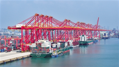 8月22日,在山东港口日照港集装箱码头,轮船在停泊作业(无人机照片)。记者从山东港口日照港了解到,2024年1月至7月,日照港货物吞吐量同比增长6.1%,集装箱量同比增长11.1%。其中,外贸集装箱吞吐量同比增长13.2%,呈现稳中向好的发展态势。