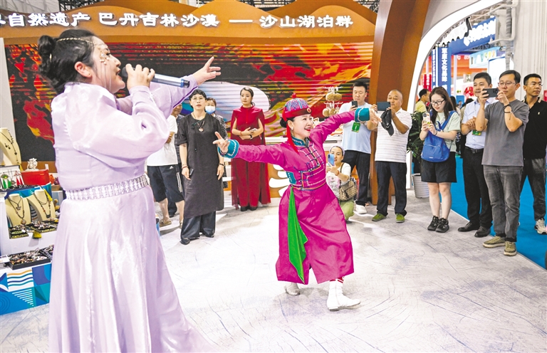 8月31日,观众在阿拉善盟展厅观看歌舞表演。第八届内蒙古自治区文化产业博览交易会上,自治区12盟市立足各盟市产业特色,推出“压箱底”绝活儿,全面展现内蒙古厚重的文化底蕴与文化发展成果,提升北疆文化品牌影响力、传播力。本报记者 王磊 白雪 摄