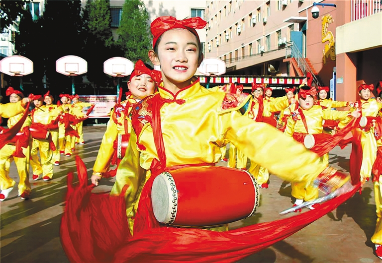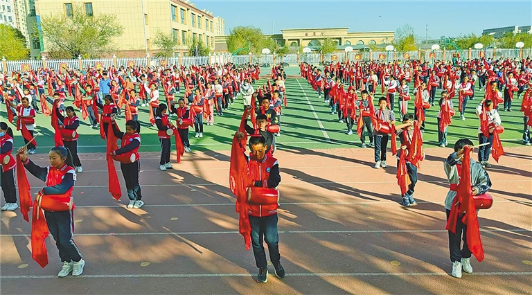 据介绍,该校安塞腰鼓特色项目开展十几年来,从最开始的二三十人的腰鼓队伍,慢慢发展成百人腰鼓队伍,再经过专业的教练教授,目前已经扩大至千人腰鼓队。每到大课间时间,校园里总能看到腰鼓的“身影”。针对一二年级的低年级学生,体育教师还会利用体育课时间训练腰鼓动作。目前,全校学生已达到人人参与腰鼓训练,人人会跳腰鼓。同时,学校教师还编写了《安塞腰鼓校本课程读本》,以兼顾安塞腰鼓的健身性和艺术性,保证这项传统民间大型舞蹈艺术形式在校园落地生根不走样。