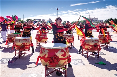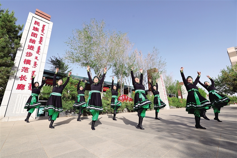 | 二连浩特市业余乌兰牧骑在奥林匹克公园民族团结进步模范长廊排练节目。 |