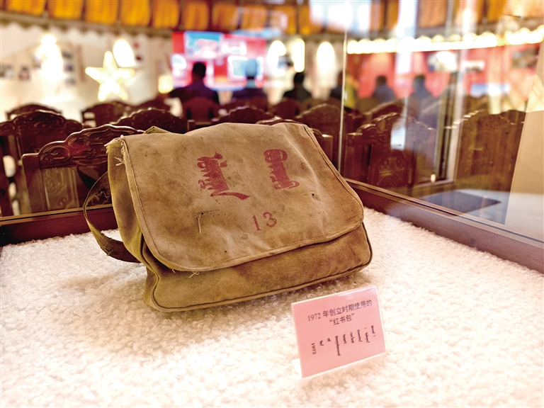 | “红书包”新时代文明实践教育基地展示的1972年创立时期使用的“红书包”。 |