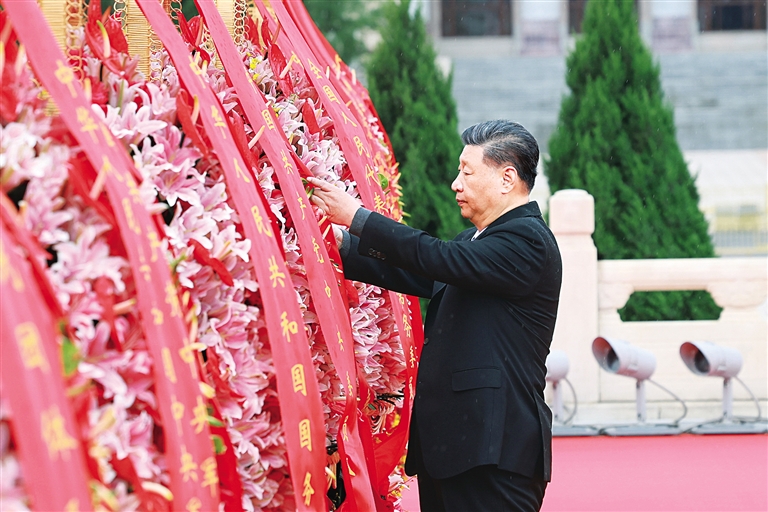 习近平迈步上前,仔细整理花篮缎带。随后,习近平等党和国家领导人缓步绕行,瞻仰人民英雄纪念碑。