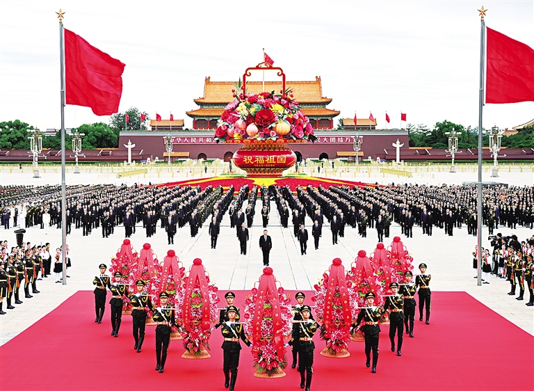 壮阔的天安门广场上,鲜艳的五星红旗迎风招展。广场中央,“祝福祖国”巨型花篮表达着对祖国繁荣昌盛的美好祝福。巍然耸立的人民英雄纪念碑北侧,两组花坛上镶嵌着白菊等鲜花组成的18个花环,寄托着全体中华儿女对英烈的深切缅怀。